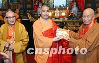 图:两岸佛教人士互赠送礼品 2002年02月22日 13:56 ![]() 在西安参加法门寺佛指舍利赴台湾地区瞻礼(供奉)活动的两岸佛教人士,二十二日上午来到西安大慈恩寺参观,该寺方丈增勒法师向台湾佛教人士赠送礼品。中新社记者 钱兴强 摄