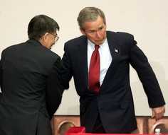 幽默和尴尬——外电报道布什访华过程花絮(图) 2002年02月22日 17:08 ![]() 清华校长王大中扶住差点绊倒的布什(美联社) 中新网北京2月22日消息:布什对中国的访问在坦诚和热情的气氛中进行,两国领导人就中美关系和国际形势等重大问题进行了重要的会谈,而访问过程中也出现了一些有趣的花絮。 布什遇上两次小麻烦 据德新社报道,今天布什座车的轮胎在赴宴途中爆裂,迫使他换乘后面的车辆。当时他刚结束在清华大学的演讲,正赶往北京市中心的中南海与江泽民主席共进午餐。布什被迫放弃自己的豪华轿车,但是没有延误他与江主席的会晤。爆胎是美国总统今天遇上的第二次尴尬。 此前,布什在清华大学的演讲赢得了两三百名学生的热烈掌声,但是提问环节结束后,他在走过讲台准备与中国官员握手时脚底绊了一下。布什显然试图化解这一尴尬场面,顺势做了要与一名中国官员拥抱的样子。 清华演讲不乏幽默 美国的《纽约时报》的报道说,布什在中国高等学府清华大学的演说时有幽默之处。在提问环节,布什的中文译员最开始居然准备把总统的回答翻译成她自己“出色”的英语。布什笑着说:“她在纠正我的英语。” 还有一次,一名学生问布什是否鼓励自己的双胞胎女儿来中国学习。布什再次笑答:“恐怕她们不再听我的话啦,如果你明白我的意思的话。”