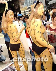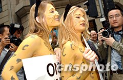 ![]() 两名美国爱护动物组织的少女,28日在香港中区闹市赤身举起“只有畜生,才有皮毛”的抗议牌,反对即将在香港举行的「2002年国际毛皮及时装展」。中新社图 洪少葵 摄