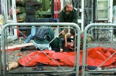 耶路撒冷发生自杀炸弹袭击 至少两人死亡(图) 2002年03月21日 23:29 ![]() 一名伤者在死者遗体边接受急救 中新网北京3月21日消息:耶路撒冷市中心今天发生自杀性炸弹袭击,造成至少两人死亡,另有四十人受伤。此事对美国推动中东和平进程的努力无疑又构成沉重打击。 当地警方说,事件发生在当地时间21日下午4时25分左右。出事地点靠近最近发生的多起枪击与炸弹袭击地区。 目击者说,多辆救伤车在事发后赶到现场并载走许多伤者,警方已封锁现场,方便进行救人的工作。 据以色列电台报道,初步报告指出,有7名伤者的伤势相当严重。