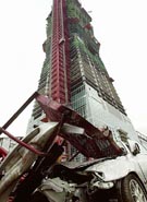 台北"地标"建筑坠物停工 倾斜民宅将连夜支撑 2002年03月31日 20:08 ![]() 台北“金融大楼”吊臂坠落砸毁轿车并造成伤亡。 中新网香港3月31日消息:台北讯,台北“国际金融大楼”工地在今天的大地震中吊臂坠落,造成至少4人死亡多人受伤的惨剧。台北当局已经要求业者停工。 预定兴建101层楼的台北“国际金融大楼”,曾被预计为台北未来的一座“地标”性的建筑,目前已经兴建到一半的高度。但在地震发生时,架设在顶部的两具吊臂与支架发生松脱而堕落,其中一具甚至掉落在马路上。 依照当局规定,任何工地都必须依照规定设置防震性的防护措施。但“金融大楼”顶楼的吊臂在设置时是否合乎安全规定?吊臂支撑是否稳固?将成为当局调查的重点。 台北市的“建筑管理处”今天已要求调查业者在施工时是否做好安全措施,并厘清肇事责任归属。 此外,台北市承德路一座民房因为强震而部分倒塌,台北市“副市长”欧晋德在7名受困民众全部被送往医院后表示,将连夜完成支撑建筑体的工作,避免这栋倾斜的楼房进一步倒塌。