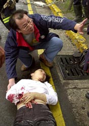 组图:台湾“三三一”地震台北灾难现场 2002年04月01日 09:02 台北百层金融大楼起重机坠落现场。(法新) ![]() 警察查看从工地坠落的起重机。(法新) ![]() 一名男童在地震中受伤。(法新) ![]() 一驾车女子受伤,等待接受救治。(美联) ![]() 救援人员抢救一名伤者。(法新)