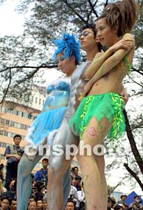 组图:广州街头展示人体彩绘吸引众多摄影发烧友 2002年04月06日 18:03 ![]() 广州某摄影器材城为吸引顾客,六日上午在门口公开展示人体彩绘,吸引上百名发烧友前来拍摄。中新社图 柯小军 摄