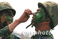 ![]() 解放军空降兵某侦察兵部队,四月在野外空降演练时,官兵们根据地貌互相在脸部涂抹迷彩进行伪装。中新社记者 王丽南 摄