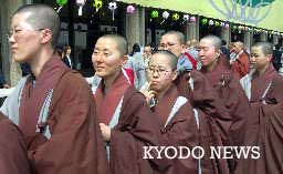 图文:韩国佛教界为世界杯出力 为大赛成功祈祷 2002年04月10日 15:52 ![]() 参加祈祷日韩世界杯成功举行集会的韩国僧尼们(9日下午共同社记者记者摄于汉城市内)