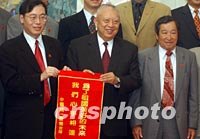 董建华会见台湾"中国统一联盟一国两制参访团" 2002年04月11日 08:38 ![]() 香港特区行政长官董建华,4月10日在香港礼宾府会见台湾中国统一联盟“一国两制参访团”,团长王津平(左一)向董建华赠送锦旗。中新社记者 任晨鸣 摄
