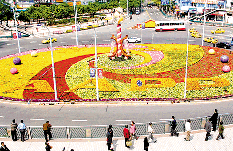 今天,用10万盆各色鲜花,地球、文字造型等组成的“AAPP”大型标志性景点在上清寺转盘建成。