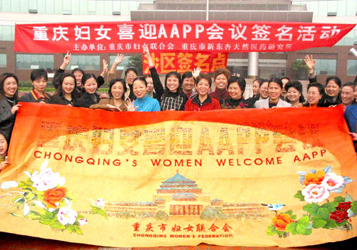 重庆妇女喜迎AAPP艺术画卷礼赠盛会 2002年04月15日 15:44 ![]() 重庆晨报 鞠芝勤摄 中新网重庆4月15日消息:一幅以“重庆妇女喜迎AAPP会议”为主题的大型妇女签名艺术画卷,昨日在沙区出炉。这幅画卷由重庆市主城区的女画家们精心绘制,具有浓郁的中国传统文化特色。据悉,这一活动画卷将由AAPP会议重庆筹备工作办公室转送给全国人大AAPP会议筹备组。