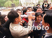 图:在京媒体密切关注国航坠机事件 2002年04月15日 20:04 ![]() 15日,中国国航班机坠毁的消息传出后,国航官员向守候在首都机场办公楼外的各国媒体分发材料时,被团团围住。中新社记者 郑萍萍 摄