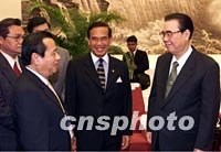 ![]() 中国全国人大常委会委员长李鹏十六日在北京人民大会堂会见前来出席亚洲议会和平协会第三届年会的泰国国会主席乌泰·屏猜春(右二)。中新社记者 毛建军 摄