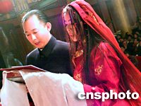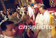 ![]() 台湾名人陈履安之子日前在京新婚,来自尼泊尔、台湾等地的佛徒赶到北京,参加陈宇廷和藏族姑娘央金拉姆的婚礼,争相为新婚人送哈达。作者:王丽南
