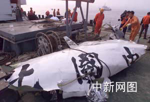 图:又打捞起较大残骸 “中国北”字样清晰可见 2002年05月11日 21:54 ![]() “五-七”空难现场打捞部门今天又打捞出一块较大的失事飞机残骸,残骸上“中国北”三个字清晰可见。(中新社记者王丽南摄)