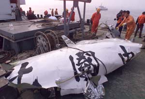 图文:打捞起重要飞机残骸 搜寻范围进一步缩小 2002年05月12日 07:32 ![]() “五-七”空难现场又打捞出一块较大的飞机残骸,残骸上“中国北”三个字清晰可见。(中新社记者王丽南摄) 中新网大连5月12日消息:昨日深夜11时25分,交通部救捞局局长宋家慧给新华社记者打手机说:“今天搜救工作取得重要进展,打捞起飞机顶盖、起落架、应急发电机、应急门、轮胎等重要飞机残骸,这将对事故原因分析起到重要作用。” 据新华社报道,宋家慧的声音在电话里提高了声调:“更重要的是,根据已打捞出水的机头残骸到机尾残骸的位置,我们已经把飞机坠落的区域缩小在长600米、宽400米东西方向海域内,为下一阶段的‘黑匣子’打捞和搜救工作开展打开了新的局面。” 据宋家慧介绍,明天一些救捞船只将暂时调离现场,等待从国外调集的“黑匣子”专用控测设备到达后再次展开新一轮打捞工作。(完)