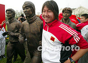 ![]() 沈阳绿岛宾馆日前为中国足球队竖立铜质雕塑,队员们兴致勃勃为各自的铜像揭幕后合影。中新社图 胡金喜 摄
