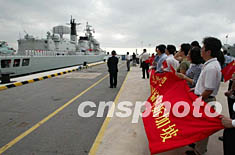 图:中国海军环球航行访问舰艇编队抵达新加坡 2002年05月23日 19:07 ![]() 由“青岛号”舰、“太仓号”舰组成的中国海军首次环球航行访问舰艇编队,五月二十三日上午抵达新加坡海军基地樟宜港,开始对新加坡进行为期3天的友好访问。这是中国人民海军舰艇编队首次对新加坡进行友好访问。中新社图 跃胜岐 摄