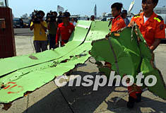 图:打捞出的华航客机残骸 2002年05月26日 16:24 ![]() 5月26日下午,搜索人员打捞出失事华航客机部分残骸。中新社记者 任晨鸣 摄