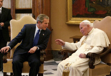 图:布什会见罗马教皇 讨论天主教性丑闻事件 2002年05月29日 11:21 美国总统布什在梵蒂冈与罗马教皇约翰·保罗二世举行短暂会晤。会晤中谈及有关中东危机和美国罗马天主教性丑闻等问题。法新供中新