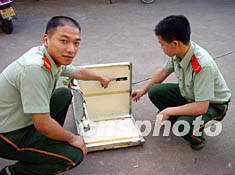 图:一块华航空难客机残骸运抵泉州 2002年05月30日 10:37 ![]() 五月二十九日下午,“闽泉渔0一七九号”渔船将打捞出的一块华航客机残骸交予边防派出所。这块客机残骸是一块“T”字型的铝合金边的木板,木板边沿上刻有“409A”、“409”两处红色标记,一块木板右上侧贴有一小块黑色的铁皮,上面印有“MAX.INSERT”和“WEIGHT 40.0 POUNDS”两排英文字母。徐承彬 摄