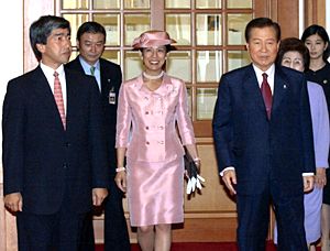 5月30日在汉城,出席日韩世界杯开幕式的日本天皇的弟弟高元宫偕夫人拜访韩国总统金大中。共同社图