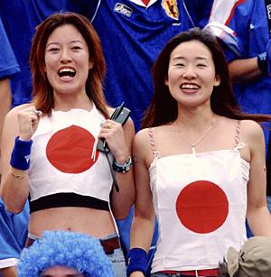 观看日本与比利时队比赛的日本女球迷身着性感装为日本队加油。共同社图