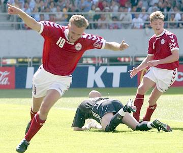 世界杯A组丹麦队与法国队场上比分为丹麦队1-0领先。丹麦19号罗梅达尔为丹麦队先拔头筹。图为罗梅达尔在庆贺进球。共同社图