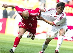 中国足球队(白衣)十三日在汉城世界杯体育场迎战土耳其队,结果中国队以零比三败北。图为中国队杜威在进攻中被对手扯住球衣。作者:毛建军