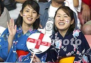 图:日本女球迷为英格兰队助威 2002年06月15日 22:52 ![]() 世界杯足球赛八分之一决赛十五日在日本新泻开赛,英格兰队(白衣)以三比零大胜丹麦而进入八强。图为身穿和服的日本女球迷为英格兰队助威。作者:毛建军
