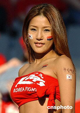 2002韩日世界杯半决赛第一场比赛韩国队与德国队的比赛将于6月25日晚在汉城进行,图为韩国女球迷性感亮相。