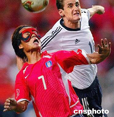 图:德国VS韩国 克洛斯争顶力压金泰映 2002年06月25日 20:23 ![]() 6月25日韩日世界杯第一场半决赛,德国与韩国队的比赛正在韩国汉城上岩体育场进行,目前场上比分为0:0。图为韩国队7号金泰映与德国队11号克洛斯争顶。