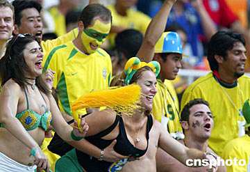图:巴西球迷热情如火 2002年06月27日 16:56 ![]() 世界杯足球赛四分之一决赛巴西队与英格兰队的比赛,二十一日在日本静冈举行,结果巴西以二比一获胜而进入四强。热情似火的巴西球迷在看台上呐喊助威。作者:毛建军