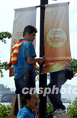 图:港会展中心挂庆祝标语迎香港回归五周年 2002年06月28日 20:41 ![]() 香港会议展览中心将于7月1日举行第二届特区行政长官就职典礼,及庆祝香港回归祖国五周年活动,6月28日会展中心一带高挂庆祝标语,迎接特区成立五周年。洪少葵 摄