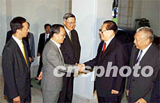 图:香港特区政府高官在礼宾府迎候江泽民主席 2002年06月30日 22:00 ![]() 六月三十日晚,国家主席江泽民在香港出席特区政府成立五周年庆祝宴会。江泽民主席在香港礼宾府与特区政府“高官”握手。潘索菲 摄