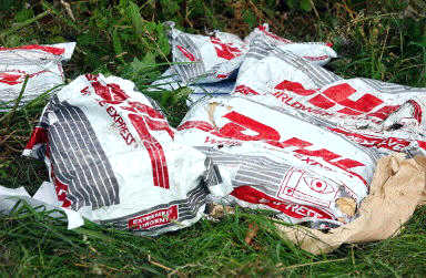 图文:DHL公司的邮袋散落在地 2002年07月03日 14:36 德国当地时间7月1日夜(北京时间2日晨),一架DHL公司的波音757货机和俄罗斯巴什基尔航空公司的图-154客机在德国巴登-符腾堡州于伯林根镇上空相撞并坠毁,至少已造成71人死亡,其中包括52名儿童。图为DHL公司的邮袋散落在地。(春风)