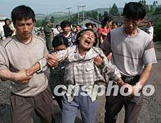 目击:白山市江源县“七·四”矿难大救援侧记 2002年07月05日 16:03 ![]() 三十九名矿工被困井下生死不明,其家属闻讯后悲痛欲绝。目前抢救工作正在紧张进行中。吴兆飞 摄 中新社白山七月五日电题:为了井下三十九名矿工兄弟 ——白山市江源县“七·四”矿难大救援侧记 作者 吴兆飞 祝子众 程泽 记者赶到白山市江源“七·四”煤矿瓦斯爆炸事故现场已过中午,距事故发生已十几小时,现场目睹了“七·四”矿难的紧张有序的救援工作。 发生事故的富强煤矿从一九九六年开始采煤。二OOO年三月四日中午十二时三十分,随着瓦斯爆炸的轰隆巨响,二十一名矿工永远告别了这个世界。而今天,又有三十九条生命在这里悬于一线。 富强煤矿东侧有一个大煤堆,上面有缆绳、矿车等设备。主井坐落在煤矿两侧,这里聚集着四十多名矿工,正在紧急救援。在主井旁边,记者看到四十多名工人分成三组:一组集中在塌方的坑道里,正在向外转移塌下来的泥土、石块、支柱和横梁;一组聚集在坑道一侧,将扔上来的泥沙运走;一组分散在四周,用矿车向外搬运塌方的泥石、木材等。 记者在现场看到悲痛万分的矿工陈在先,他的二哥在此次矿难中被埋在下面。据陈介绍,他们来自四川简阳农村,是他鼓动二哥一起到这里赚钱,本想有个照应,没想到发生了矿难。他听到爆炸声,拼命从住处跑到发生矿难的井口,当时井口还冒着烟。他边流泪边拼命地用手挖土,向外搬石块。“当时我没有感到一点疼痛。”不久大家都赶来救援。 在井口,记者看到救援人员的脸被煤灰染黑。因为天气闷热,很快汗水成泥淌了下来,不时迷住双眼,他们就用袖子擦一下,继续挥锹清理……据一位刚换下来的救援矿工说,“我们矿工在一起很长时间了。一日不见,他们就被埋在地下,那可是三十多个兄弟呀!我们不管付出多大代价也要把他们找到。” 据悉,事故发生后,造成主井口部位十多米的泥石塌方,将井口覆盖,要想救援,先要清除这里的塌方物。主井东侧还有一个副井,此时风扇已经打开,紧急向外排放瓦斯气体,坑道有三百多米长,救援的工作人员从副井进去以后,走了大约五十延长米,发现前方塌方严重,再进入很可能发生不测,于是撤出来商量救援对策。 与井口挖掘抢险工作同时进行的副井口疏通排气工作也在紧张进行,紧急排放瓦斯爆炸后产生的有毒气体,并有可能在此井口实施抢救。当记者离开现场时,副井口周围由于排出的有害气体的积聚,为了安全,现场已开始疏散除抢救人员以外的工作人员,并严禁摄像、拍照、打手机等一切可诱发再次爆炸的不安全举动。 事故发生后,吉林省副省长李介车带领白山市、江源县有关官员迅速赶赴现场,下到坑道里进行巡视,征求有关专家意见后拟定了初步抢险方案 目前,事故抢险工作正在紧张有序地进行,矿区社会状况平稳。(完)