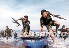 图:解放军冲锋舟武装抢滩登陆演习 2002年08月03日 17:28 ![]() 沈阳军区官兵今夏在东北某海域进行水上多项军事课目训练,演习武装抢滩登陆,向既定目标快速挺进。作者:马樯