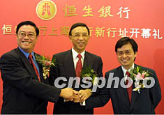 图:恒生银行在沪推出人民币服务 2002年08月09日 17:30 ![]() 九日,随着恒生银行上海分行新行址落户浦东,恒生银行也同时在沪推出人民币服务业务。图为恒生银行大中华业务总裁王联章(左)、恒生银行副董事长兼行政总裁郑海泉(中)、恒生银行上海分行行长苏长贵在新行址开幕仪式上。作者:汤彦俊