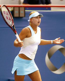 中新网北京8月16日消息:俄罗斯性感美女库尔尼科娃,最近在英国《男人帮》杂志对美国、法国及意大利等国家共5.9万名男读者进行的全球民意调查中,被选为十大丑女之一,排名第六位。但出奇的是,她在七月份却被该杂志推举为二零零二年全球最性感女人。但无论结果如何,凭着凹凸惹火的身材、清纯少女的面孔,她已经令世界万千男士“兴奋雀跃”。 职业网球手的库尔尼科娃,凭其可爱的面孔,诱人的魔鬼身材,已征服了很多男士的心灵。她的外型神态与美国六十年代性感女星玛丽莲梦露有点相似。她在几个月前替运动用品公司爱迪达所拍的运动鞋广告,模仿当年梦露在电影《七年之痒》的造型,虽然风骚野性程度不及前辈,但两代性感美女同样以优美的臀部征服了男士。有“库娃”出场的网球赛事,肯定生“色”不少。 据香港文汇报报道,虽然这位美少女球技不算了得,投身职业网球七年从未取得任何大满贯赛事的单打锦标,但凭着出众的外貌及身材,令她成为广告界宠儿,获利甚丰。据估计,她一年的广告收入高达一千万美元,令当今女士羡慕不已。她曾为欧米加手表及Berlei运动内衣等拍广告。 这位年轻有钱的性感尤物,当然不可缺少男人的慰藉。“库娃”在七月初与拉丁情歌王子伊格莱希亚斯,一同入住伦敦某家酒店,但因“叫声”凄厉,遭到住客的投诉。一位住客称道,“他们真的很吵耳,我甚至听到她的尖叫声,听起来就是在做爱时的呻吟声。” 此外,与她合作的男网球手,相信会较难集中精神比赛,因他们的注意力已投放在库娃的身段上。 小甜甜最美 章子怡很丑 十大美女第一名为美国歌星小甜甜,其他入选者还有高尔夫球手伍滋的女友瑞典模特艾莲、巴西球星罗纳尔多妻子美莲妮、英国已故王妃戴安娜、德国模特克劳迪亚、西班牙影星潘妮洛普·克鲁兹、法国影星苏菲·玛索、澳洲影星妮可·基德曼等。 十大丑女则有《国家地理杂志》中的“阿富汗少女”、英国模特纳奥米、德国网球员格拉夫、拉丁歌星詹妮佛·洛佩兹、中国影星章子怡、俄罗斯网球员库尔妮科娃、法国影星茱丽叶·比诺什等。对于“中国美女”章子怡,一直以“国际影星”自居的她自从演了几部跨国制作的大片之后,就极少在国内露面,即使出现也是一副巨星派头,动辄数十保镖护身,与国人保持距离。也许就是她这种盛气凌人的样子,也使老外感到厌烦,觉得即使她长相再美,也不是真正的美女! 祸不单行 库尔尼科娃加网出局 俄罗斯网球手库尔尼科娃,周三在加拿大公开赛第二圈以五比七和一比六不敌西班牙球手柏丝古尔。库尔尼科娃赛后表示自己状态不好,导致落败。她现时将收拾心情,准备迎接在两周后进行的美国网球公开赛。 对于今场比赛,她表示“今天总是每样事情有点不畅顺,令我表现很差,未能发挥平时水准。”在单打失利后,库尔尼科娃又在随后进行的双打比赛再遭败绩,她赛后又归咎“状态不好”。 表现不稳定的她,令她的世界排名大起大落。她在发挥水准时,世界排名升至第四十位。但由于脚伤及失准,她的世界排名由职业生涯最高的第八位急跌至第九十九位。然而,不时与男人纠缠、在广告界获利丰厚的她,能专心比赛或许有点难度。她将返回加州,为本月廿六日举行的美国公开赛备战。 库尔尼科娃个人档案 生日:1981年6月7日 出生地:俄罗斯莫斯科 常驻地:美国佛罗里达 头发:金发 眼睛:褐色 身高:1米73 体重:54公斤 理想职业:网球运动员或演员 最喜欢的比赛:法国公开赛 最喜欢的颜色:蓝色 爱 好:阅读、音乐、电视、跳舞和聚会 打 法:正手右手握拍;反手双手握拍 装 备:Yonex球拍,adidas服装和运动员鞋 教 练:斯洛兹尔 进入职业网坛:1995年10月 四大满贯往绩: 1997年,1999年,2000年澳网,打进第四轮 1997年温网打进准决赛,2000年温网打进第二轮 1998年,1999年法网,打进第四轮;2000年法网,打进第二轮 1996年,1998年美网,打进第四轮;2000年美网,打进第三轮
