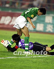 二零零二年中国甲A足球联赛第十七轮赛事--北京国安对云南红塔队的比赛十八日晚在北京工人体育场举行,国安队凭借国脚徐云龙的一粒入球而获胜。图为红塔队“国门”区楚良飞身在对手胯下扑救险球。作者:毛建军