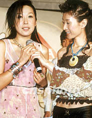 日前,2002MTV-莱卡风尚颁奖大典在北京王府饭店举行。图为获奖歌手孙悦(左)和著名节目主持人李霞在发布会上。钱兴强 摄