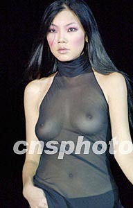 意大利著名服装名牌“盖·马帝洛”,日前首次在北京举行精品时装展示会。图为模特展示迷人的透视女装。钱兴强 摄