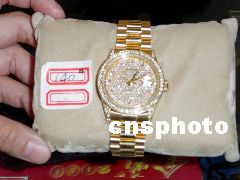 图为起拍价为五万七千四百元的“劳力士”手表,据拍卖行介绍,该表表芯为原装,“满天星”表面是后来镶嵌上的。