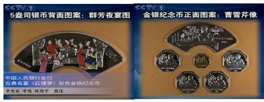 据央视16点新闻报道,该套纪念币正面图案均为《红楼梦》作者曹雪芹像,并刊有国名和年号。1/2盎司金币背面图案为湘云醉眠图,面额200元,发行量8000枚;1盎司银币共4枚,面额均为10元,发行量均为38000枚,背面图案分别为:元春归省图、惜春作画图、熙凤弄权图、宝钗扑蝶图;5盎司银币背面图案为群芳夜宴图,面额50元,发行量11800枚。