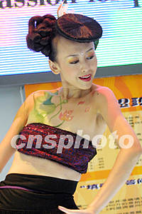 2002亚洲信息技术展览会二日在上海浦东新国际展览中心开幕。各参展商纷纷各显神通宣传自己的产品。图为一展台请来人体彩绘表演为自己的产品宣传助阵。作者:汤彦俊