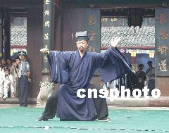少林、武当、峨眉三大武术门派精英赛二日下午在峨眉山下报国寺举行,图为武当派掌门人游玄德宗师向观众展示的武当太乙逍遥拳。作者:鲁彦