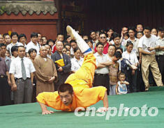 少林、武当、峨眉三大武术门派精英赛二日下午在峨眉山下报国寺举行,武术精英聚会峨眉山一展各门派绝技,为中外游人献上一顿丰盛的“武”餐。图为少林弟子李少辉向观众展示的蝎子拳。作者:鲁彦