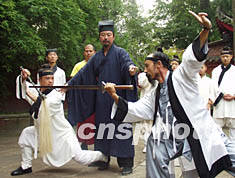 少林、武当、峨眉三大武术门派精英赛二日下午在峨眉山下报国寺举行,图为武当弟子场下苦练本门武功,准备上场比赛。作者:鲁彦