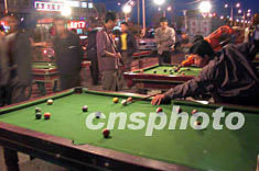 出青海西宁市沿青藏公路西行,沿途最常见的消遣方式是打台球。在格尔木的一条夜市上,数张台球桌都被爱好者占据。作者:王丽南