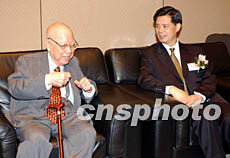 图为中国新闻社香港分社社长杨首民与香港工商及科技局局长唐英年言谈甚欢。