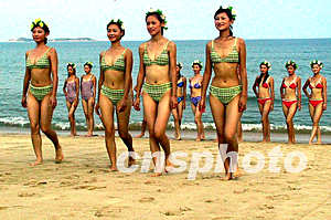 四日,第十届“美在花城”广告新星大赛的靓女身穿泳装亮相广东南澳岛海滩,给宁静的沙滩留下一道亮丽的风景。作者:刘卫勇