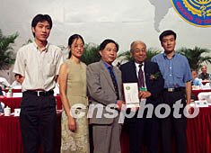 杨焕明、汪建、于军等七人因完成水稻基因组和建立中国基因组分析基地作出杰出贡献而获得了2002年求是"杰出科技成就集体奖"。图为香港知名人士、实业家查济民先生(右二)在中国科协学术年会上为获奖者颁奖。作者:陈雯